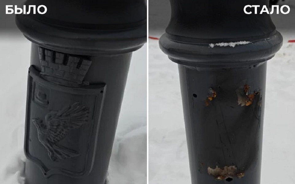 Ночью несколько молодых людей подъехали на автомобиле, расшатали одну из световых опор и оторвали от нее декоративный герб.