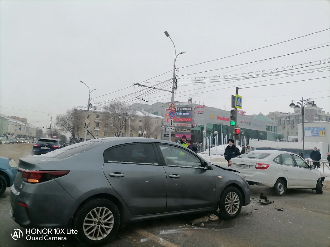 Авария произошла на площади Победы, у пешеходного перехода. Как минимум один автомобиль получил серьёзные повреждения, о пострадавших не сообщается.