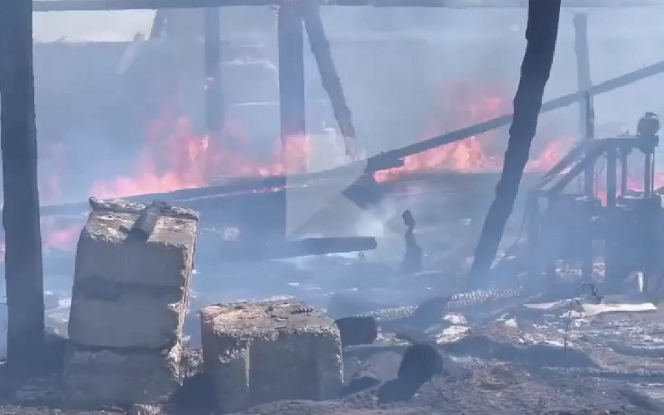 Сейчас конструкции проливают водой, чтобы не допустить повторного возгорания из-за тлеющих частей. Повреждено здание пилорамы, древесные отходы.