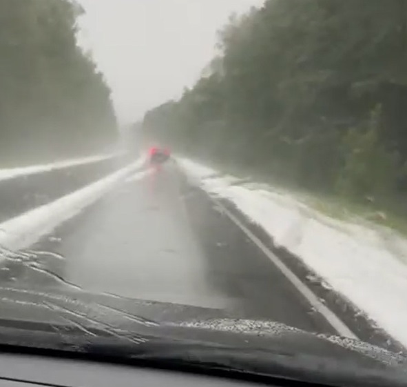 В посёлке Передельцы под Рязанью выпал град, который лёг вдоль дороги белым ковром.