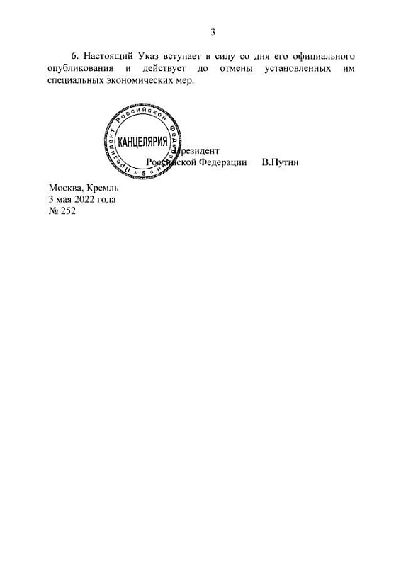 Путин поручил правительству РФ за 10 дней составить перечень таких лиц. Документ вступает в силу с момента опубликования и действовать до отмены специальных экономических мер.
