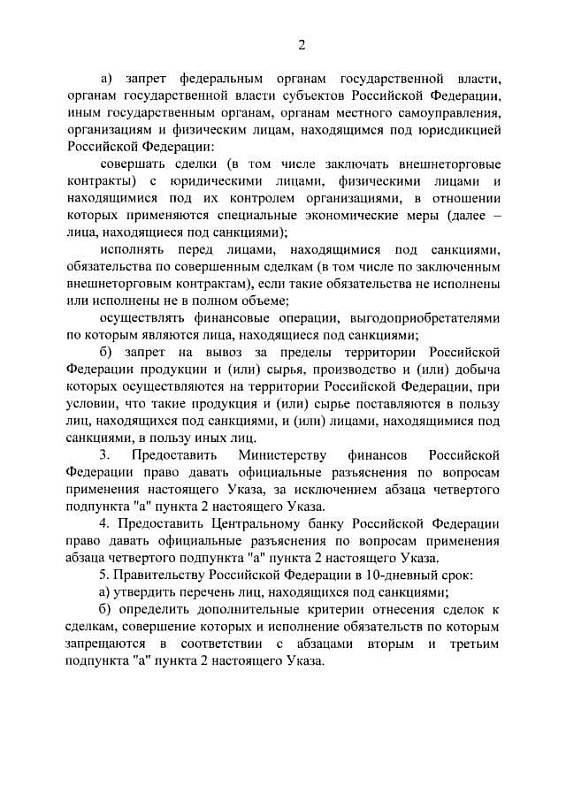 Согласно указу, запрещается совершать сделки и исполнять обязательства перед зарубежными физическими и юридическими лицами, которые попали под ответные санкции России. Также запрещается вывозить сырьё и продукцию в пользу таких лиц.