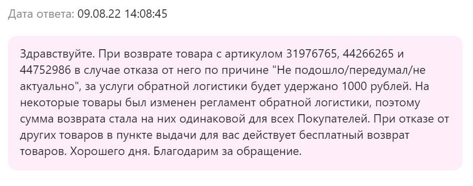 В Wildberries сообщили, что речь не идёт о введении такой меры массово, он затрагивает около 10% пользователей: «Мы применяем оплату услуги обратной доставки товаров только для клиентов с высокой долей возвратов и/или невысокой суммой выкупа – утверждения о том, что это "массовый штраф", являются недостоверной информацией».