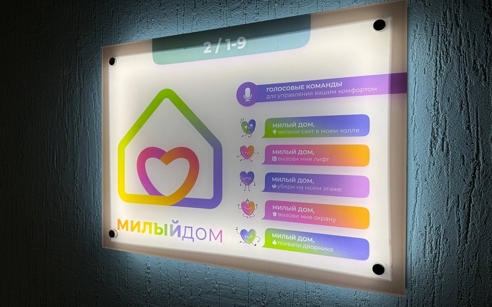 Но - пройдем в сам дом. Чистота, простор, свет, дизайн — это есть сейчас, пожалуй, во многих современных ЖК. Но «Еврокласс-4» помимо этого может похвастаться уникальным преимуществом: здесь мы ступаем на территорию, управляемую искусственным интеллектом. Хотите вызвать лифт? Достаточно подать команду. Голосовой помощник «Милый дом» все сделает за вас. Использовать удобно и просто — памятка есть на стене в холле.