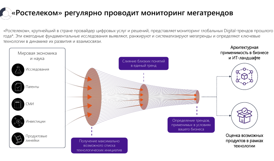 Один из методов оценки, например, предполагает мониторинг миллионов научных публикаций и патентов, которые регистрируют по всему миру, в первую очередь в США, Европе и Китае. Становится понятно, куда готовы вкладывать деньги инвесторы и над чем ломают головы лучшие IT-специалисты планеты. Это позволяет «Ростелекому» понять, что нужно изменить уже сейчас, чтобы быть во всеоружии, когда тренд заполнит мировое цифровое пространство.