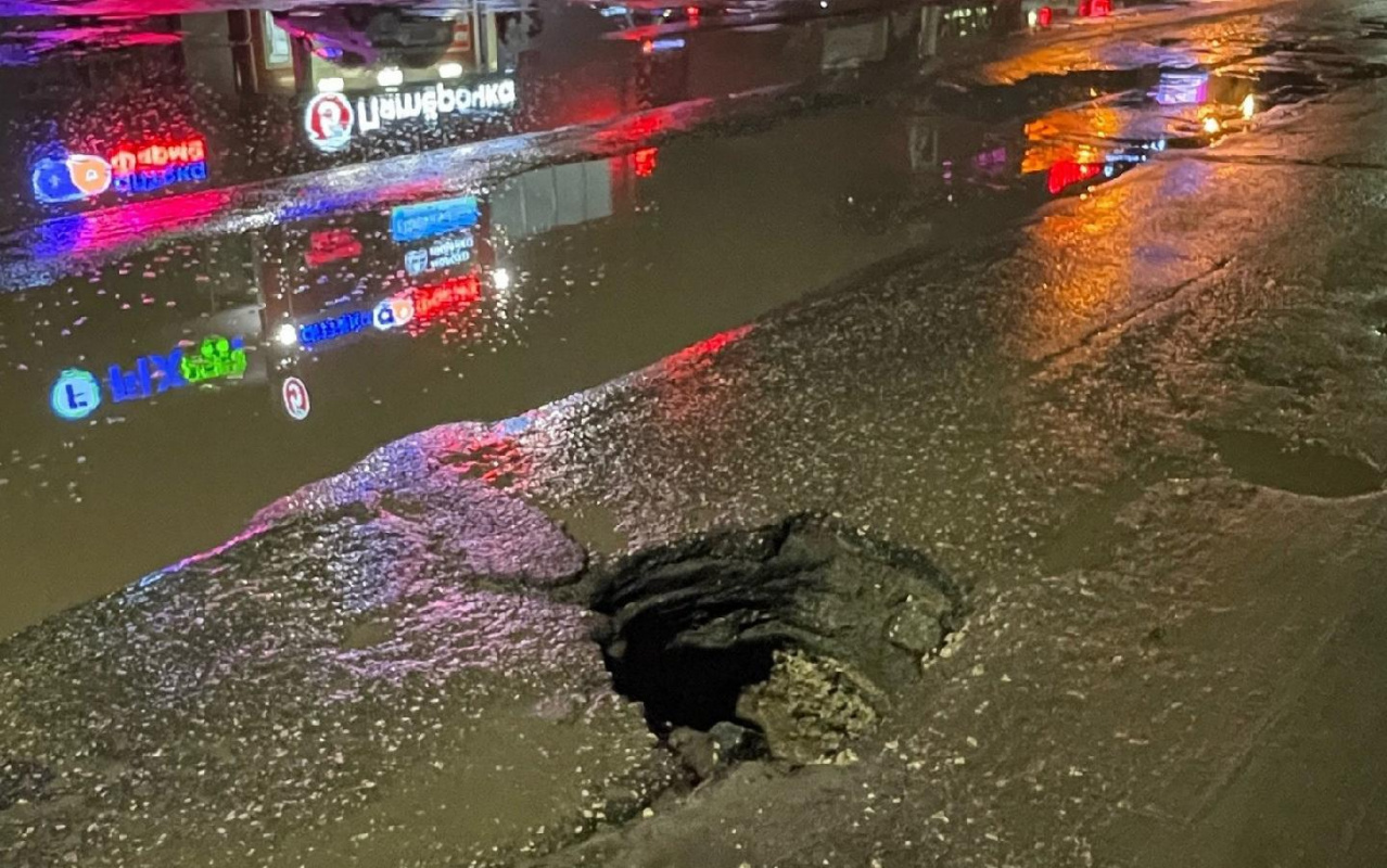 Судя по кадрам, на дороге образовалась яма после провала асфальта. Жители уточнили, что дыра появилась на улице Советской.