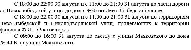Так, движения запретят по части дороги от Новослободской улицы до дома № 36 по Лево-Лыбедской улице с 6:00 29 августа до 21:00 31 августа; по частям Лево-Лыбедской и Николодворянской улиц, прилегающих к территории филиала ФКП «Росгосцирк» с 6:00 30 августа до 21:00 31 августа; по части улицы Горького, примыкающей к саду Рязанского музыкального театра с 6:00 до 13:00 30 августа.