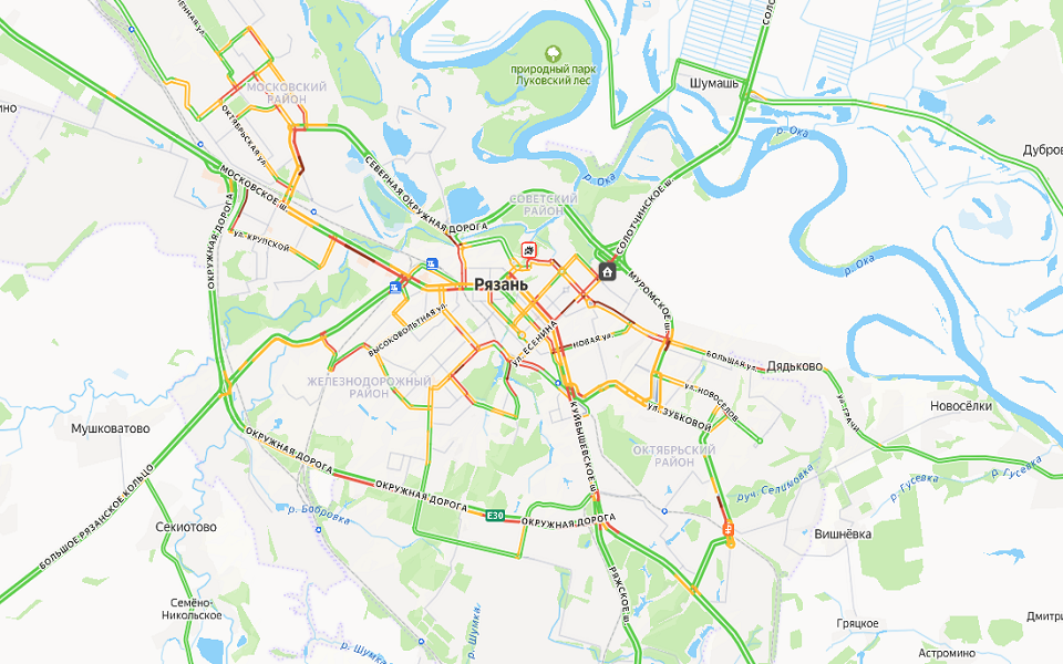 Согласно данным сервиса Яндекс-Пробки, дорожная обстановка оценивается утром среды в 9 баллов. Хуже всего дела обстоят на Московском и Касимовском шоссе, на Северной окружной, на Новой улице. Еле движется Куйбышевское шоссе. Стоят машины на Южной окружной, на въезде в город со стороны Дядьково.