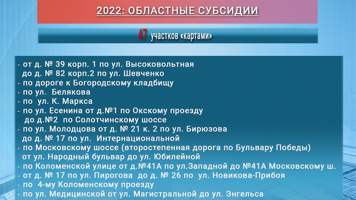 В 2022-23 годах в Рязани отремонтируют 16 участков дорог по муниципальным двухгодичным контрактам. Также в 2022 году завершится ремонт 10 участков, работы на которых начаты ещё в 2021 году. Ремонт проведут ещё на 10 участков дорог, которые запланированы на этот год и 47 объектов будут сделаны «картами». По данным мэрии Рязани, это на 30% больше, чем в прошлом году.